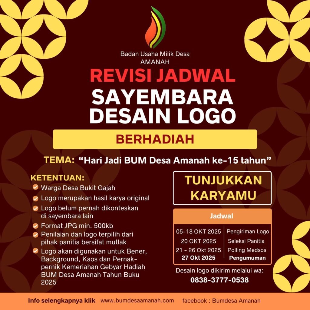 Dalam rangka mengadakan acara gebyar hadiah yang dilakukan secara rutin setiap tahunnya, kami BUM Desa Amanah memiliki niat untuk melibatkan masyarakat Desa Bukit Gajah untuk ikut andil serta bekerja sama dengan BUM Desa Amanah dalam membuat logo angka 15 semenarik mungkin. maka dari itu kami mengadakan sayembara Desain logo, sebagai apresiasi untuk pemenang, kami dari pihak BUM Desa Amanah akan memberikan apresiasi berupa uang tunai dan piagam penghargaan, serta akan kami umumkan di media sosial dan di waktu acara gebyar hadiah berlangsung. jadi tunggu apa lagi tunjukan bakatmu dan dapatkan hadiahnya, berikut ketentuan umum untuk lomba desain logo :